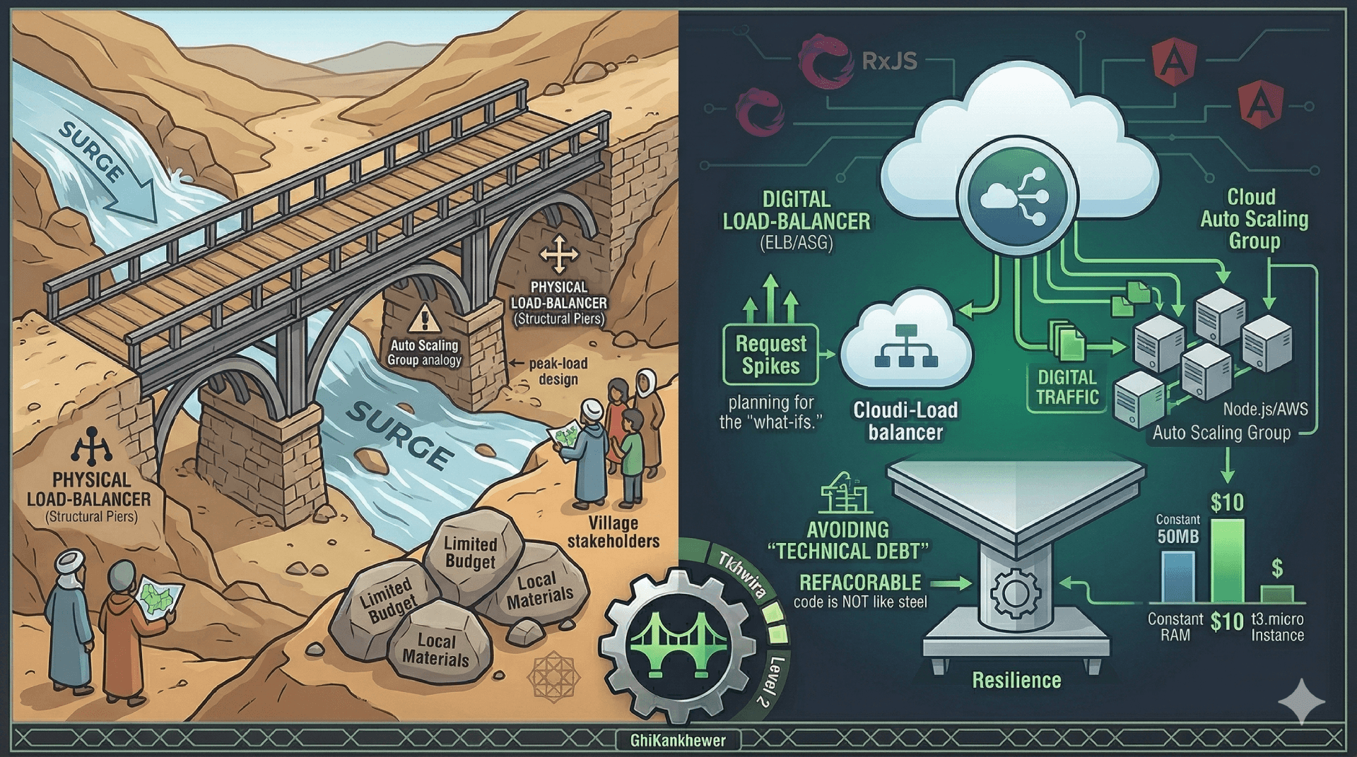 F l-cloud, k-nkhammou f l-peak d traffic o CPU. F l-douar, l-traffic houwa wahed l-wad kiy-hmal f l-wqt dyal ch-hta. Designing dyal l-qntra jani bhal ila k-nqad f Auto Scaling Group.